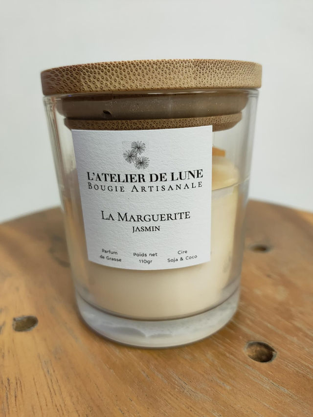 Fragrance de Grasse Jasmin. La couleur de la fleur en cire peut avoir des variations de teinte d'une bougie à l'autre.