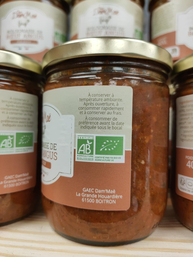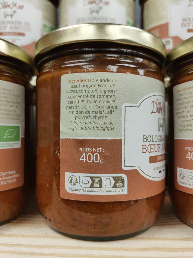Ingrédients : viande de boeuf origine France*(40%), tomate*, oignon*, concentré de tomate*, carotte*, huile d'olive*, persil*, sel de Guérande, amidon de maïs*, ail*, poivre*, thym*